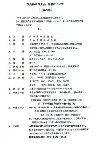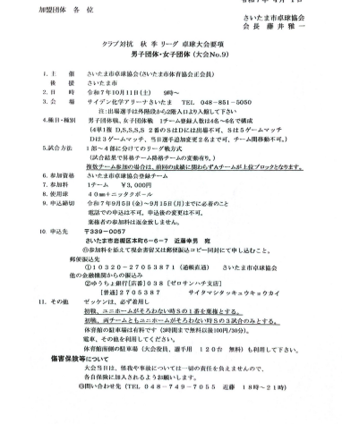 第63回戸田市卓球連盟秋季連盟戦(個人戦)のご案内